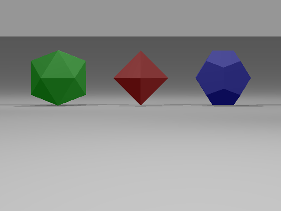Emerald, ruby and sapphire jewels on an infinite clay plain. These are icosahedron, octahedron, and dodecahedron platonic solids (convex polyhedra), respectively; and the overall scene has color, lighting and shadows.